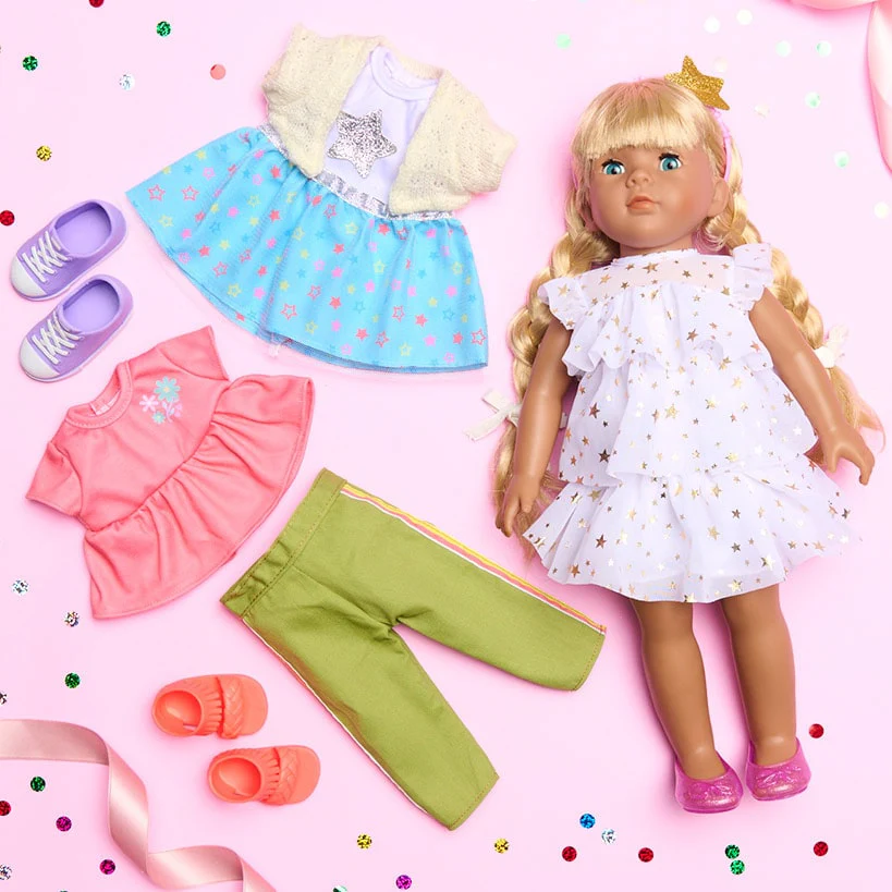 The Set of 3 18" Doll Outfits or Accessories Set will add a touch of style to your child's favorite doll, making playtime even more magical. Each piece is thoughtfully designed to inspire creativity and fun, transforming ordinary moments into extraordinary adventures. Select from Doll Accessories Set, Heart Fashion Set, Star Fashion Set, and Stawberry Fashion Set. Whether it's dressing up for a tea party or preparing for a day out, this set ensures your child's doll is always the best-dressed in town. High-quality pieces will inspire hours of imaginative play.