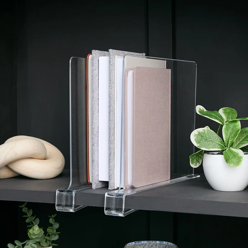 Whether you use them in the pantry or your bedroom closet, the Set of 2 Acrylic Closet Shelf Dividers helps you maximize your storage space while keeping everything easily accessible. Simply slide them onto any shelf, then organize clothing, linens, cleaning supplies, canned goods and more. No tools needed.