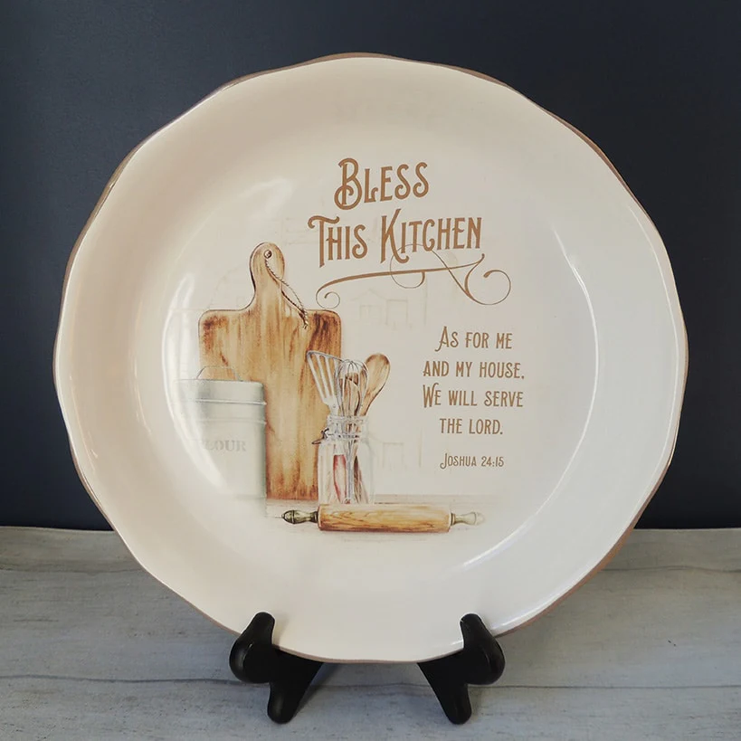 Fill your kitchen with the warmth and faith of the Bless This Kitchen Pie Plate and Prayer Plaque. The Bless This Kitchen Pie Plate not only serves up your favorite pies but also doubles as a charming display piece, bringing a sense of spirituality to your kitchen's decor. Meanwhile, the Bless This Kitchen Prayer Plaque offers a heartfelt prayer, asking for blessings over your kitchen and meals, ending in a unifying "Amen." These items are more than just kitchenware; they're tokens of togetherness and devotion, perfect for those who cherish their kitchen as a haven of gathering and faith.