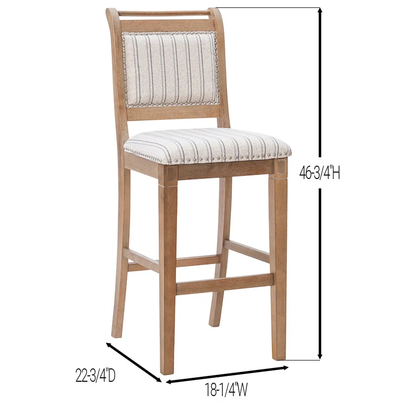 French style and farmhouse design combine to create the Emmy 30" Barstool. The washed wood is complemented by the striped ticking fabric and brushed silver nailheads. Footrails provide stability and durability to this bar height stool. This item cannot be shipped to P.O. boxes and APO/FPO addresses.