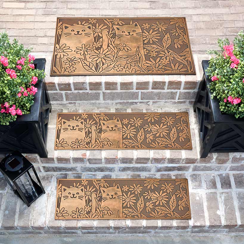 Welcome guests with the playful charm of the Garden Kitten Rubber Doormat. Featuring delightful kittens nestled amongst vibrant spring flowers with an antique metallic finish, this doormat transforms any entryway into a cozy and inviting space. Combine it with the matching Garden Kitten Stair Treads for delightful home decor.