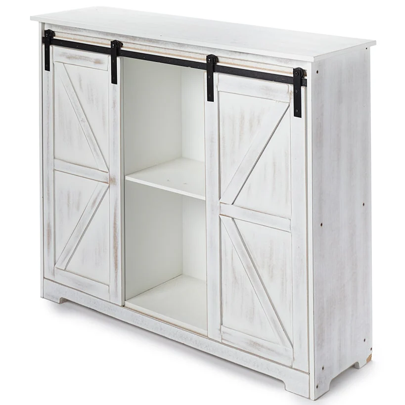 Discover the perfect blend of style and functionality with the Barn Door-Style Buffet Wooden Cabinet. This versatile furniture and home decor piece offers generous storage space with two sliding doors that always leave a portion of the interior exposed, adding a rustic charm to your room. Select from Antique White, Black, and Rustic Wood. Store everything from office supplies to everyday kitchen essentials in one place, neatly organized and easily accessible. The interior shelf extends all the way across, providing ample space for up to 60 lbs. per shelf.