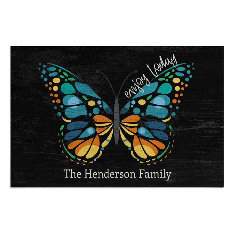Vibrant non-slip Personalized Butterfly Doormat will make your entryway stand out. Durable enough for indoor and outdoor use, it makes a wonderful housewarming gift. Personalize it with up to 24 upper- and lowercase letters. If you want the words "The" and "Family" in the design, please include them in your personalization.
