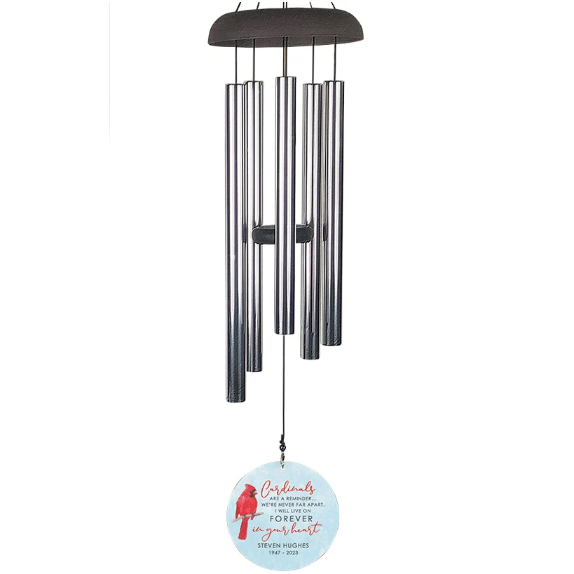 Let the sweet notes of this Personalized 30" Cardinal Memorial Wind Chime offer comfort whenever you hear them. The 4" sail features a bright red cardinal and the sentiment "Cardinals are a reminder...we're never far apart, I will live on forever in your heart." Add a loved one's name (up to 20 characters, all caps) and date range (up to 11 characters). Sorry, mail/fax orders are not accepted for personalized items; please order via web or phone agent only. This item cannot be shipped to APO/FPO addresses.