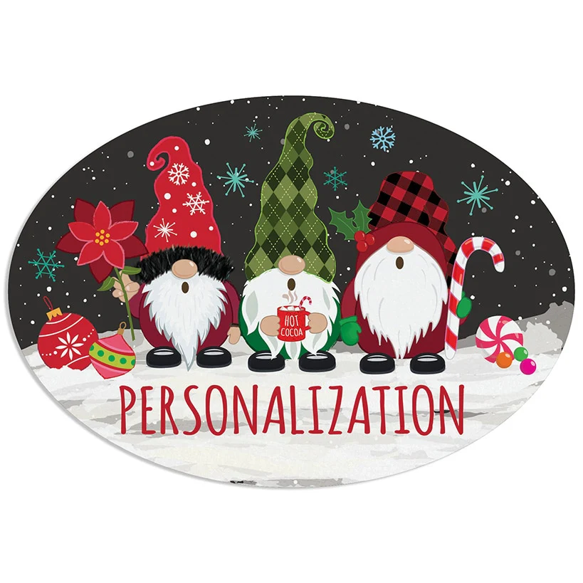 Bring whimsical holiday cheer to your home with our Personalized Christmas Gnomes Wreath Door Hanger or Oval Metal Plaque! Featuring a trio of adorable gnomes decked out in festive attire, these pieces add a playful and heartwarming touch to your decor. Personalize with 18 uppercase characters to make it uniquely yours. The word "The" is not included in the design; if desired, please include in your personalization. Sorry, mail/fax orders not accepted on personalized items; please order via web or phone agent. This item cannot be shipped to P.O. boxes and APO/FPO addresses.
