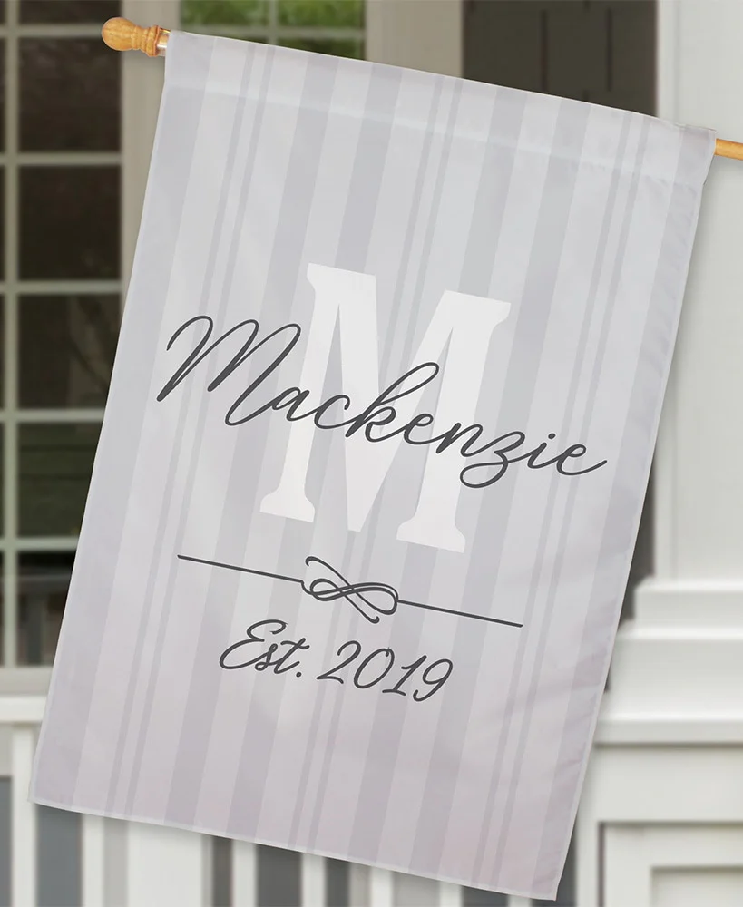 Give your home a fresh look with a Personalized Double-Sided House Flag. Display outside your home year-'round. Bless Our Home: Personalize with your name, up to 30 characters maximum. Upper and lower case. Please add "The" and an apostrophe S in your character count if needed; they are not given. Floral Burst: Personalized with a single letter monogram (1 character) and your name, up to 20 characters maximum. Upper and lower case. "The" is not given, so please include it in your character count. Gray Monogram: Personalize with a single letter monogram, your name (up to 20 characters maximum) and the year established (open line, 12 characters maximum). "Est." is not given, so please include it in your character count. Upper and lower case. Hang using your own pole.