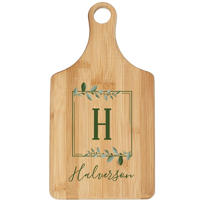 Create a wonderful custom item to display in your kitchen with our Personalized Family Name Paddle Cutting Board. Add an initial and family name (up to 12 characters) to the paddle-style bamboo cutting board. Fonts are as shown. Variations in the color and grain add to its beauty. Hole in handle allows for easy hanging. Makes a thoughtful gift! Sorry, mail/fax orders are not accepted on personalized items; please order via web or phone agent. This item cannot be shipped to P.O. boxes and APO/FPO addresses.