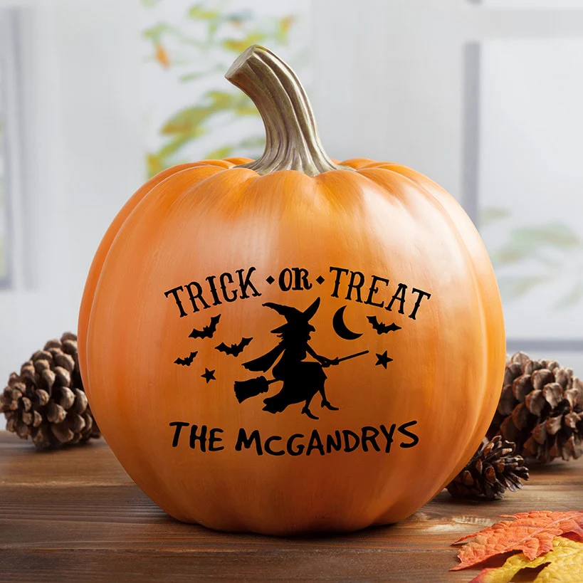 Get ready for a spook-tacular Halloween with our Personalized Halloween Trick-Or-Treat Witch Pumpkin! This charming decoration features a witch flying on her broomstick, accented by fluttering bats and the phrase "Trick or Treat" emblazoned across the front. Add your personal touch by customizing the bottom of the pumpkin with up to 16 characters in bold, uppercase letters. Perfect for your home or as a special gift, this realistic pumpkin is sure to delight trick-or-treaters and guests alike. Sorry, mail/fax orders not accepted on personalized items; please order via web or phone agent. This item cannot be shipped to P.O. boxes and APO/FPO addresses.