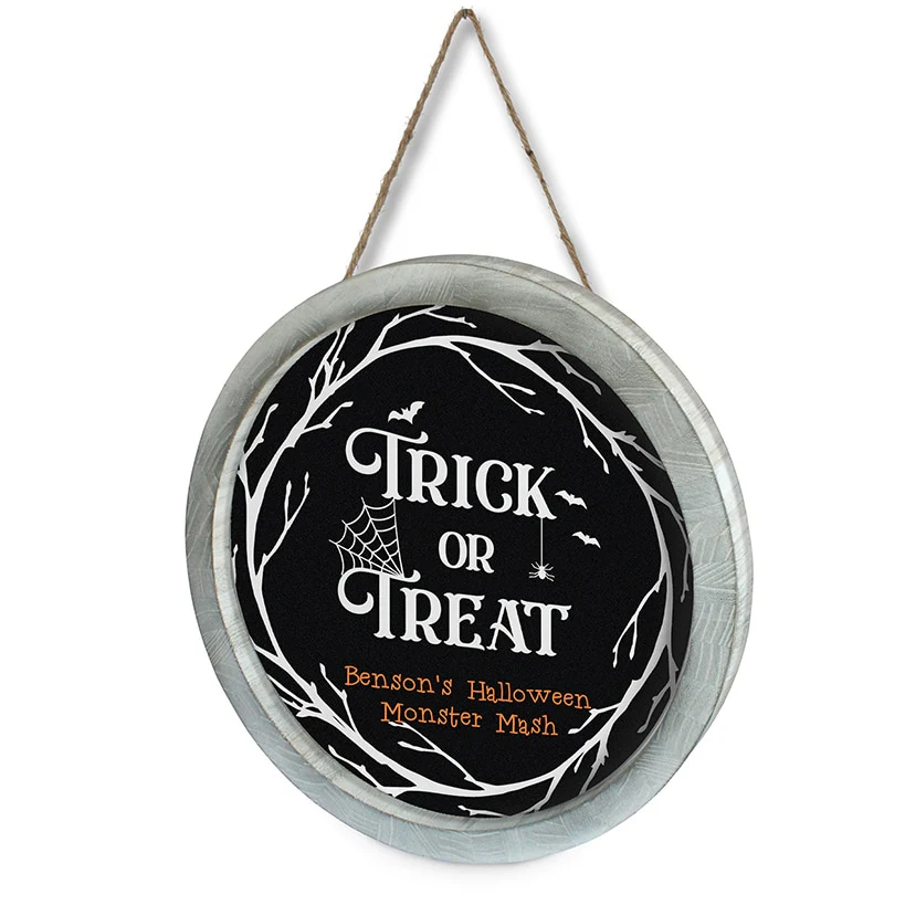 The Personalized Wall Sign Trick or Treat is the perfect addition to your Halloween decor, offering a charming and personalized touch to your home. This round sign, complete with a jute rope hanger, can be customized with any name or message up to 32 characters in all uppercase letters, making it uniquely yours. Sorry, mail/fax orders not accepted on personalized items; please order via web or phone agent. This item cannot be shipped to P.O. boxes and APO/FPO addresses.