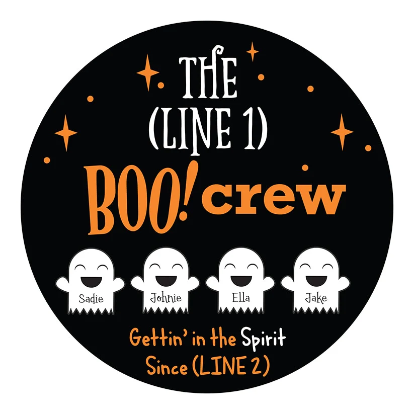 The Personalized Halloween Boo! Crew Wall Sign is the perfect way to add a festive touch to your home this Halloween season. This charming round wood sign can be personalized with your last name up to 15 characters. Then, specify 2-6 ghosts, each with a name up to 10 upper- and lowercase letters. Finally, specify a year with 4 numbers. This sign creates a truly unique display that’s bound to delight all who see it. Whether you hang it on your front door under a porch or in a cozy indoor spot, it's sure to bring smiles and a sense of spooky fun to your household. Sorry, mail/fax orders are not accepted on personalized items; please order via web or phone agent. This item cannot be shipped to P.O. boxes and APO/FPO addresses.