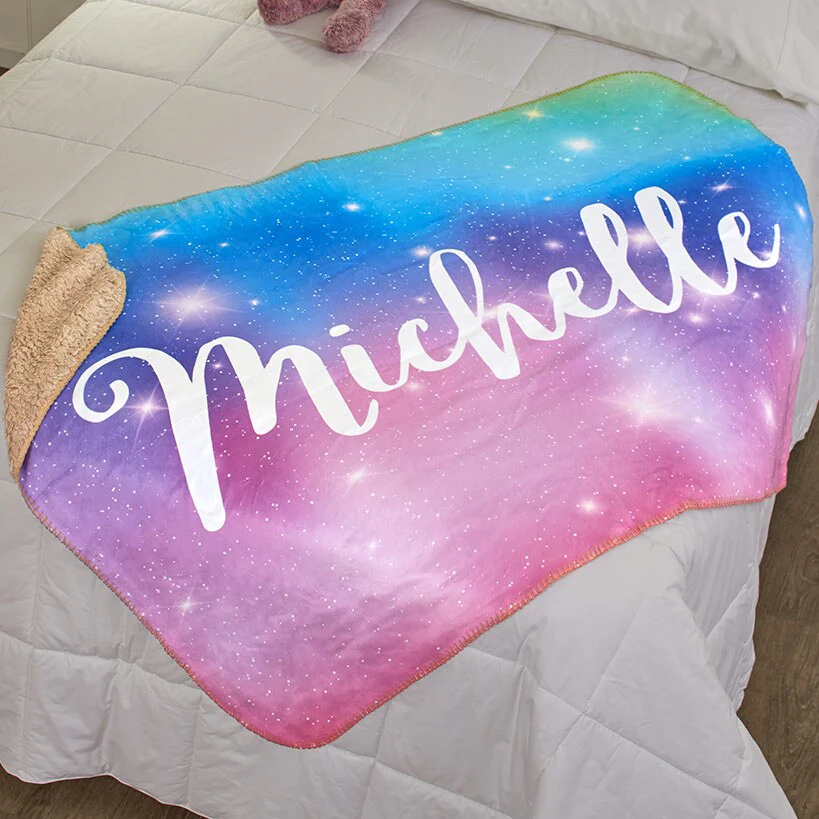 Snuggle under this Personalized Kids' Sherpa Throw. It features a printed plush front with soft sherpa backing. Personalize it with a name of up to 12 characters in upper and lower case. Sorry, mail/fax orders not accepted on personalized items; please order via web or phone agent. This item cannot be shipped to P.O. boxes and APO/FPO addresses.