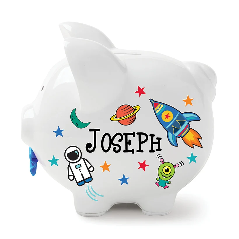 Personalized White Piggy Bank is a keepsake that's perfect for a new baby's nursery or any kid's room. Encourage children to save with a special bank made just for them. Select from Space and Floral Butterfly designs. Colorful designs surround a name of up to 9 uppercase letters. Sorry, mail/fax orders not accepted on personalized items; please order via web or phone agent. This item cannot be shipped to P.O. boxes and APO/FPO addresses.