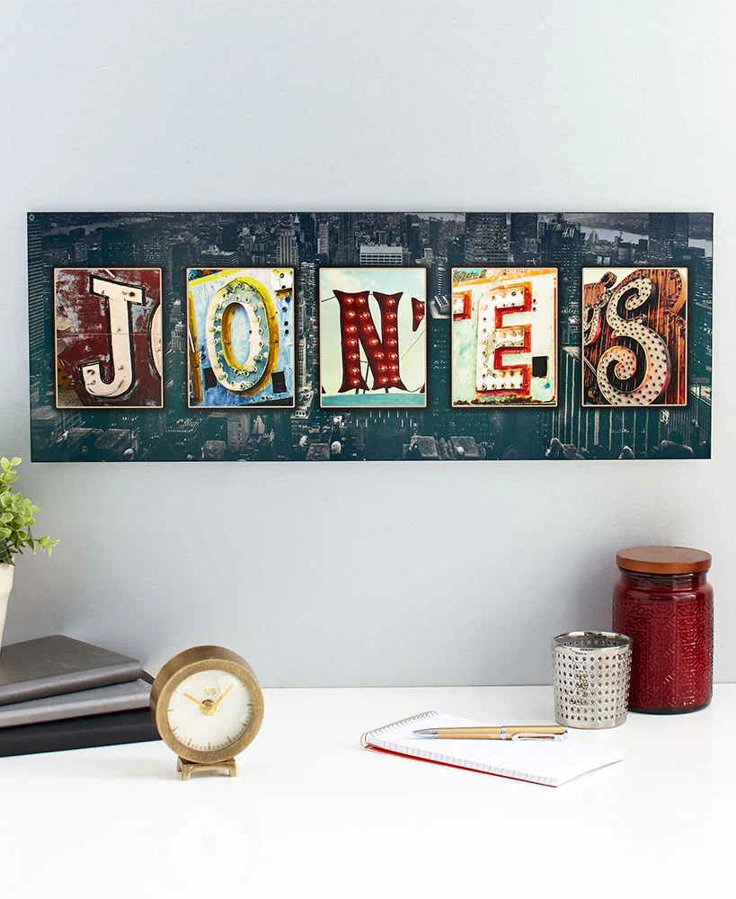This Personalized Themed Name Art features found-letter photography that spells out your first or last name. It has a high-gloss appearance with a theme that reflects your favorite things. Fits a minimum of 3 characters and a maximum of 11 characters. Ready to hang. Sorry, mail/fax orders not accepted on personalized items; please order via web or phone agent. This item cannot be shipped to P.O. addresses and APO/FPO addresses. Customized wall art complements your hobbies Details: 9" x 26"MDF