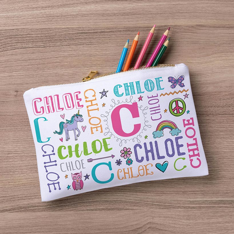 The Personalized Zipper Pouch is your go-to essential for organizing and sprucing up your everyday routine. Whether you're heading back to school or just staying busy, this vibrant pouch is designed to hold all your pencils, trinkets, or small necessities in one stylish place. With a unique touch, personalize it for a bit of flair and individuality. Choose from Butterflies, Dinosaurs, Primary Name, and Pastel Primary Name. Personalize it with any name up to 9 upper- and lowercase letters. Add another capital letter to the Primary Name and Pastel Primary Name designs. Its durable design ensures you'll carry it for years, holding everything together in style. Sorry, mail/fax orders not accepted on personalized items; please order via web or phone agent. This item cannot be shipped to P.O. boxes and APO/FPO addresses.