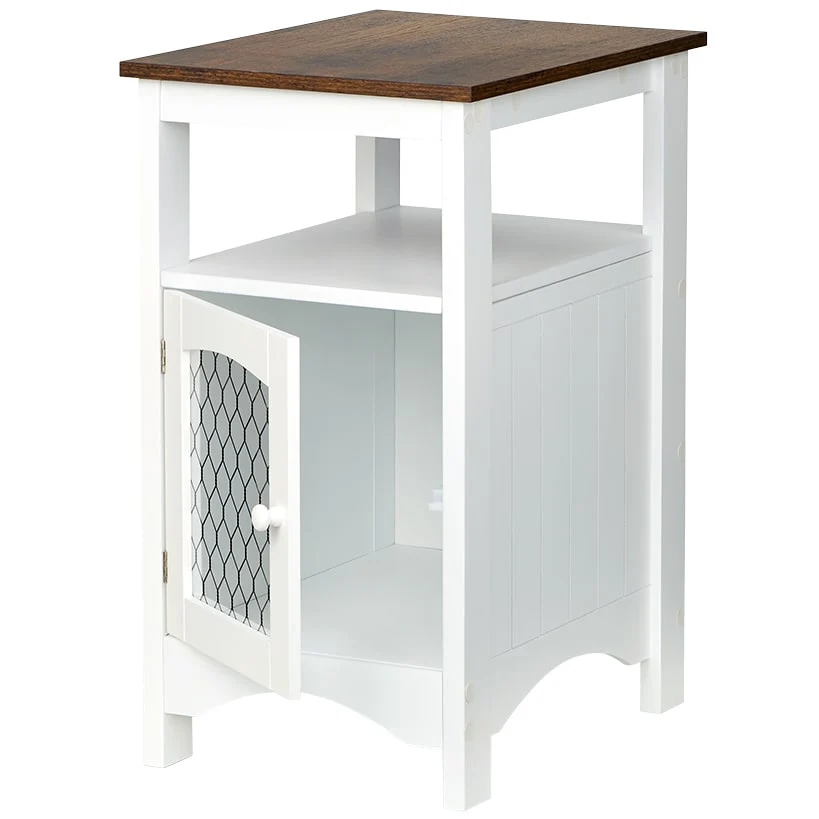 Charming Rustic Two-Tone Side Table is a bit of warmth and character for any room. The convenient cupboard, covered with a clear pane with a print of wire mesh on it, offers the perfect spot to discreetly store your essentials while adding a touch of industrial elegance. Weight capacity: table top, 44.1 lbs.; middle and shelf and bottom, 22 lbs. Holds up to 77 lbs.